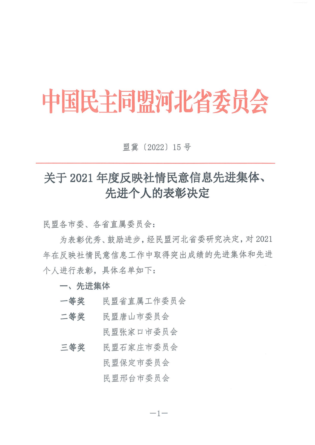 2022年5月18日,民盟省委反饋:民盟張家口市委榮獲民盟河北省委2021年參政議政工作先進單位、反映社情民意信息先進集體二等獎;安定明榮獲參政議政工作先進個人,師曉紅、張旭鳳榮獲反映社情民意信息先進個人。